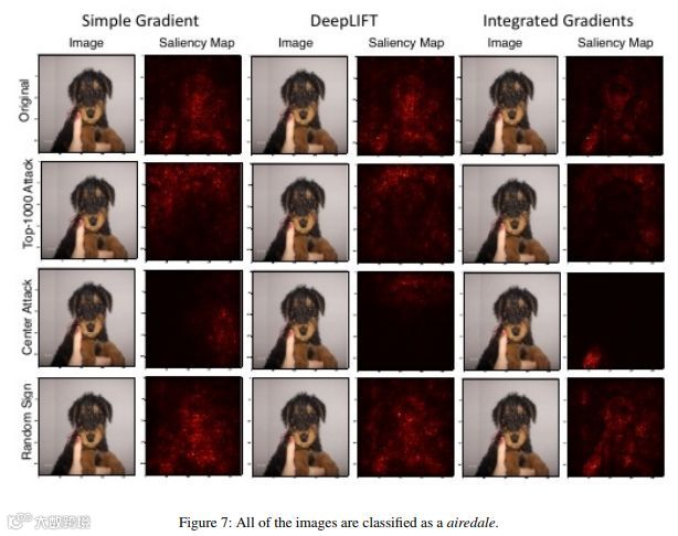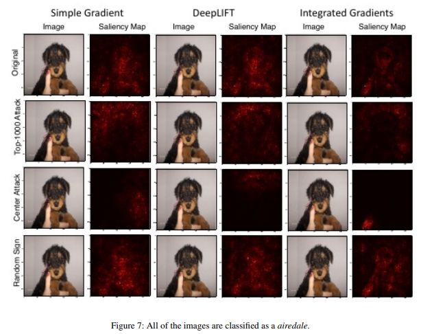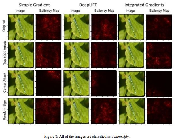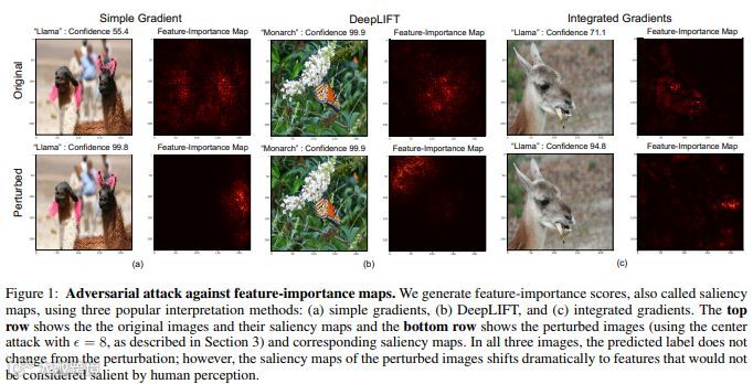 在 AAAI 2019 的一篇论文 Interpretation of Neural Networks is Fragile 中,研究者表明,可以通过引入一个无法感知的扰动,来破坏一个特定图像的显著图。