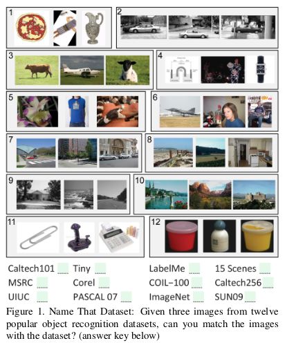这里有一篇 2011 年比较老的论文: Unbiased Look at Dataset Bias,其中,研究者根据 12 个流行的图像数据集,尝试通过训练一个分类器用以判断一个给定图像来自于哪个数据集,来探索是否存在数据集偏差。