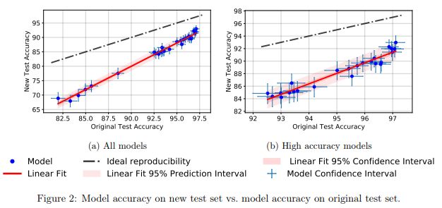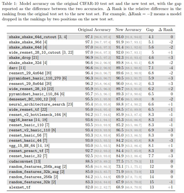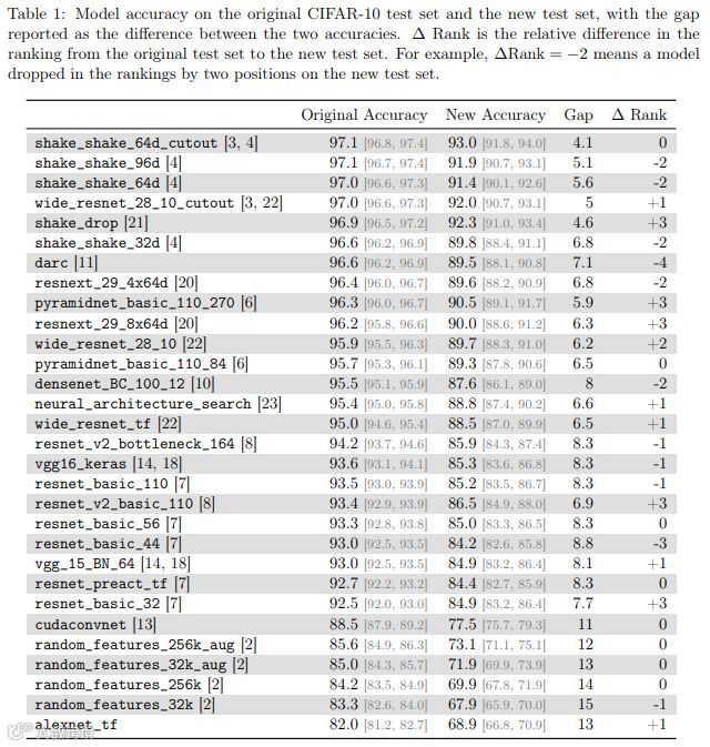 研究者发现,很多神经网络模型在从原来的测试集切换到新测试集的时候,都出现了明显的准确率下降(4% - 15%)。但各模型的相对排名依然相对稳定。