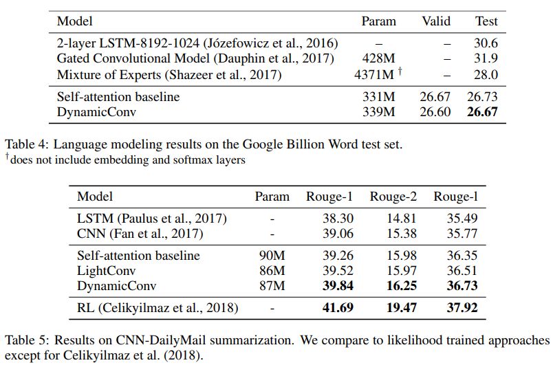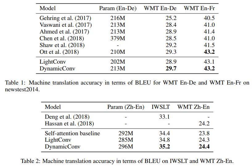 研究者也证明,在机器翻译、语言建模和抽象总结等任务上,这些新卷积能够使用数量相当或更少的参数,达到或超过基于自注意力的基准效果。