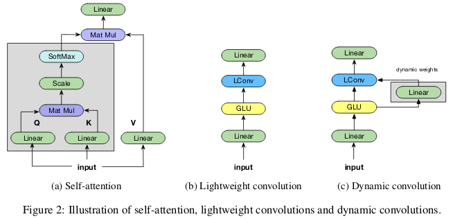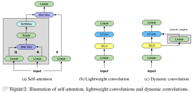 轻量级卷积(lightweight convolutions)是深度可分离(depthwise-separable)的,它在时间维度上进行了 softmax 标准化,通道维度上共享权重,且在每个时间步上重新使用相同权重(类似于 RNN 网络)。动态卷积(dynamic convolutions)则是在每个时间步上使用不同权重的轻量级卷积。