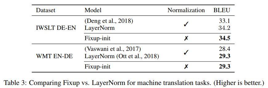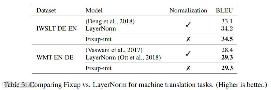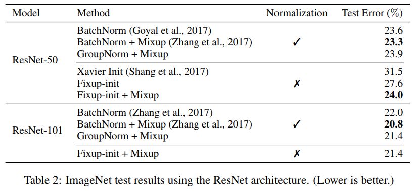 研究者也进一步展示了在没有任何标准化处理下,基于 Fixup 得到的神经网络在 ImageNet 数据集和英语-德语机器翻译任务上相当的测试结果。