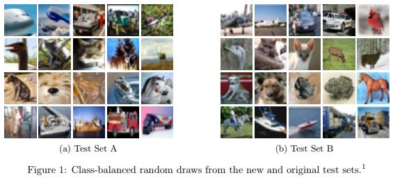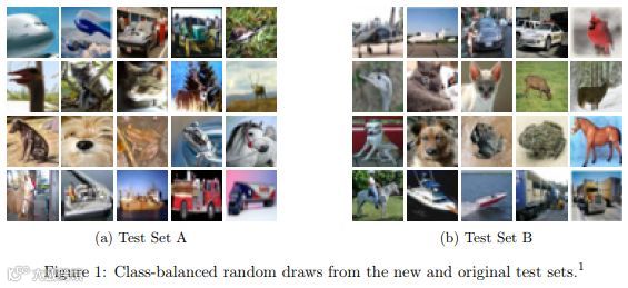 在论文 Do CIFAR-10 Classifiers Generalize to CIFAR-10? 中,研究者们通过在 CIFAR-10 上建立了一个新的测试集,来研究此问题。为此,他们解析标注了来自 Tiny Images 库的图像,就像最初的数据采集过程一样。