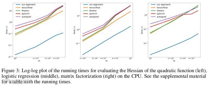 研究者通过反向传播,在三个不同问题上,测试了反向模式自动微分新方法的性能,并度量了其计算 Hessian 矩阵所消耗的时间。