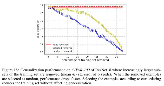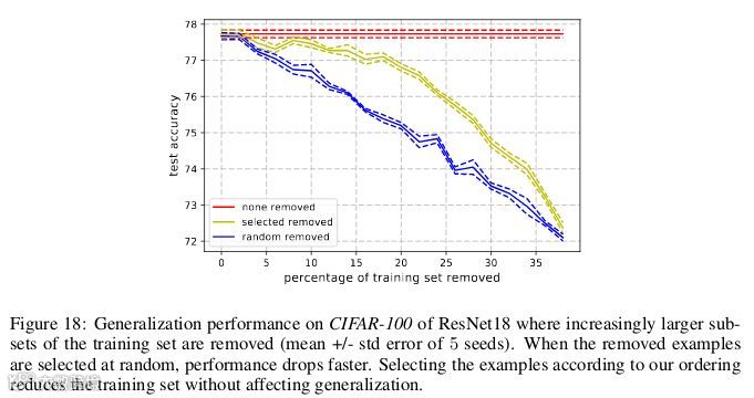 与此类似,在 CIFAR-100 上,8% 的数据可以在不影响测试集准确率的情况下移除。