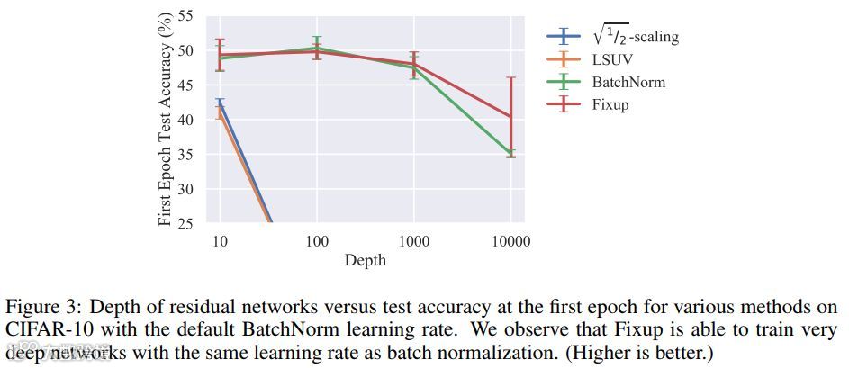 研究者比较了在 CIFAR-10 上,不同深度残差网络训练一个 epoch 的结果。并发现,虽然标准初始化方法在 100 层的网络上失败了,但 Fixup 和批标准化都在 10,000 层的网络上成功了。