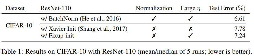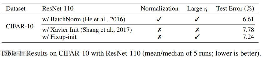 Fixup 使得能够在 CIFAR-10 上以高学习速率训练一个 110 层的深度残差网络,得到的测试集表现和利用批标准化训练的同结构网络效果相当。
