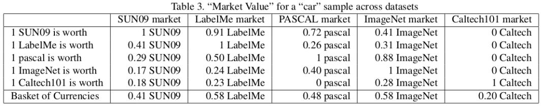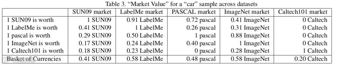 研究者在某数据集训练分类器,并在其他数据集上评估表现效果,进一步度量数据集的价值。根据这个指标,LabelMe 和 ImageNet 是偏差最小的数据集,在「一篮子货币(basket of currencies)」上得分 0.58。所有数据集的得分都小于 1,表明在其他数据集上训练的模型都给出了更低的准确度。在没有数据集偏差的理想情况下,应该有一些得分是高于 1 的。
