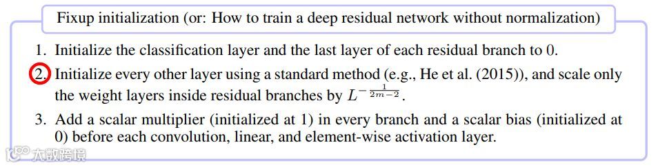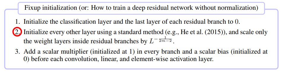 为避免此问题,Fixup 中的核心思想是在每 L 个残差分支上,对 m 个神经层的权重,使用同时依赖于 L 和 m 的因子进行调整。」