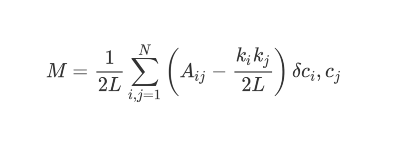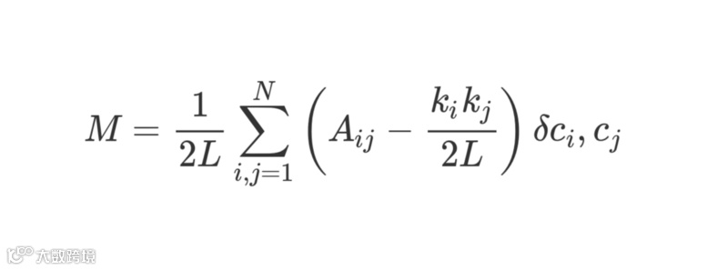 其中 L 代表网络中边的数量,k_i 和 k_j 是指每个顶点的 degree,它可以通过将每一行和每一列的项加起来而得到。两者相乘再除以 2L 表示当该网络是随机分配的时候顶点 i 和 j 之间的预期边数。