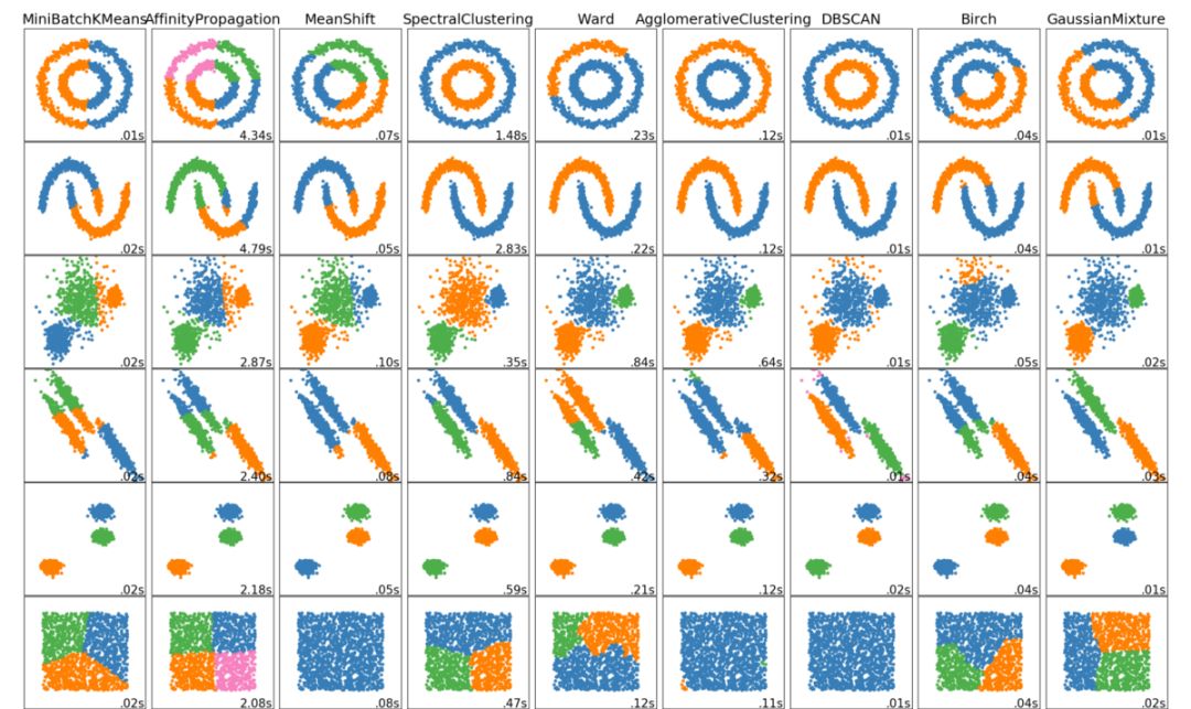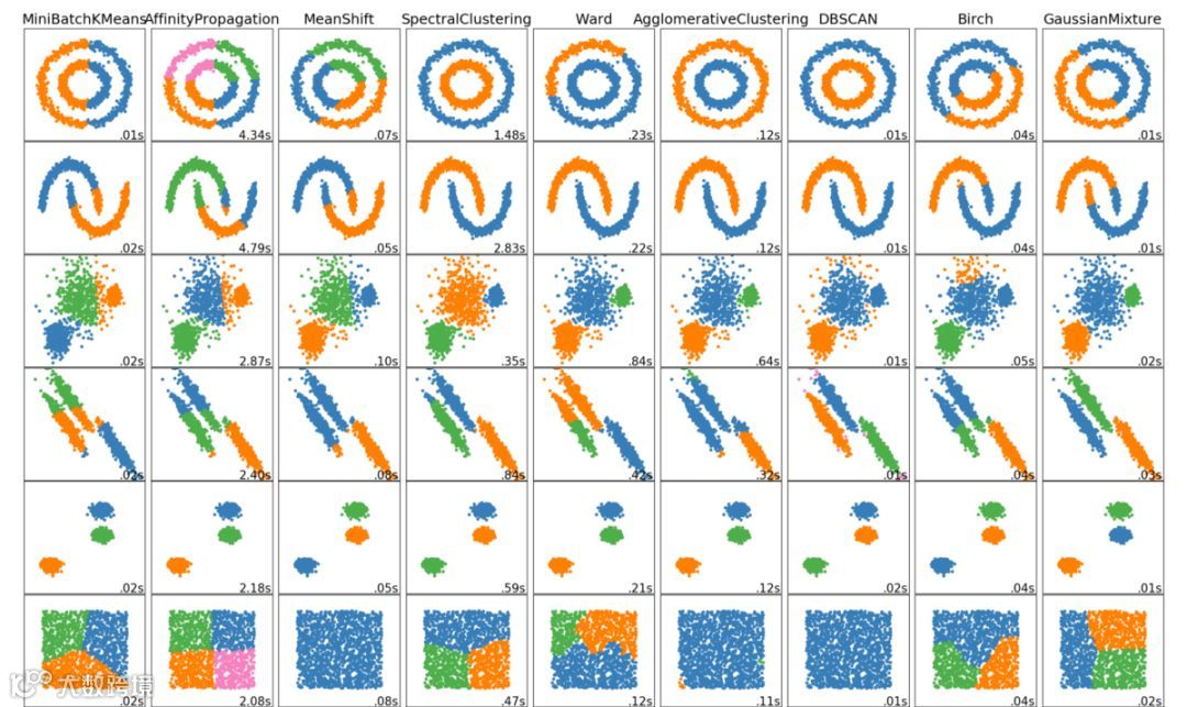 以上就是数据科学家应该知道的 6 大聚类算法!我们将以展示各类算法的可视化效果结束本文!