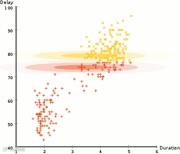 为了找到每个簇的高斯参数(例如均值和标准差),我们将用一个叫做最大期望(EM)的优化算法。请看下面的图表,这是一个高斯适合于簇的例子。然后我们可以使用 GMMs 继续进行最大期望聚类的过程。