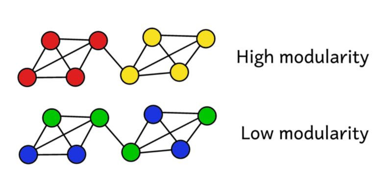 通过以上公式可以计算图的模块性,且模块性越高,该网络聚类成不同团体的程度就越好。因此通过最优化方法寻找最大模块性就能发现聚类该网络的最佳方法。