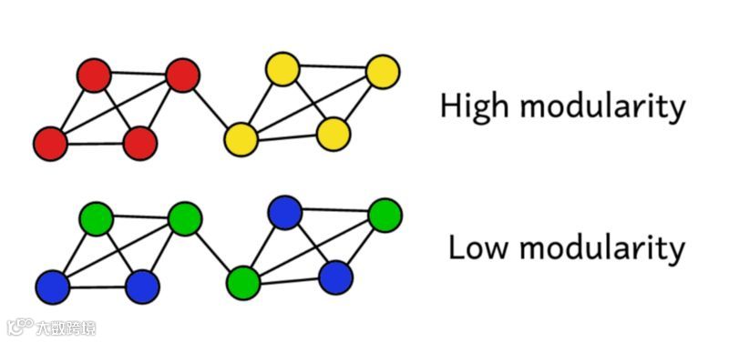 假设我们已经将该网络聚类成了一些团体。我们就可以使用该模块性分数来评估聚类的质量。分数更高表示我们将该网络分割成了「准确的(accurate)」团体,而低分则表示我们的聚类更接近随机。如下图所示: