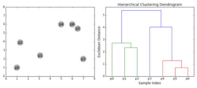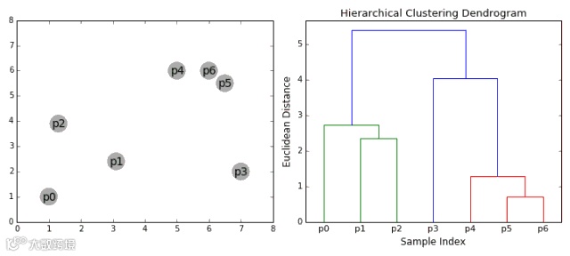 层次聚类算法实际上分为两类:自上而下或自下而上。自下而上的算法首先将每个数据点视为一个单一的簇,然后连续地合并(或聚合)两个簇,直到所有的簇都合并成一个包含所有数据点的簇。因此,自下而上层次聚类被称为凝聚式层次聚类或 HAC。这个簇的层次用树(或树状图)表示。树的根是收集所有样本的唯一簇,叶是仅仅具有一个样本的簇。在进入算法步骤前,请看下面的图例。
