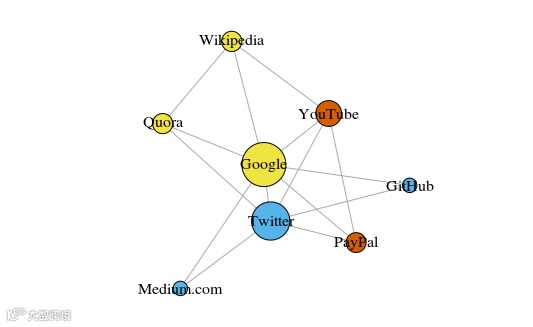 这些顶点的颜色表示了它们的团体关系,大小是根据它们的中心度(centrality)确定的。这些聚类在现实生活中也很有意义,其中黄色顶点通常是参考/搜索网站,蓝色顶点全部是在线发布网站(文章、微博或代码)。