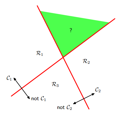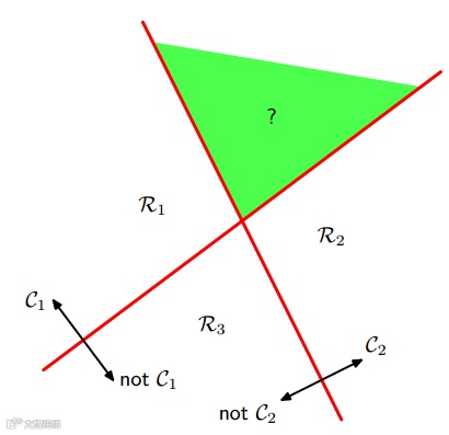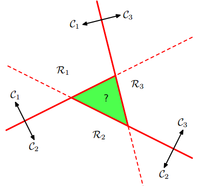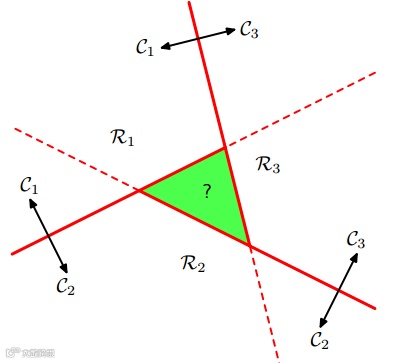 logistic回归是二分类,通过“1对1(one vs one)“分类器和”1对其他(one vs the rest)“分类器转化为多分类。但是,这两种方法会产生无法分类的区域,该区域属于多个类,如下图: