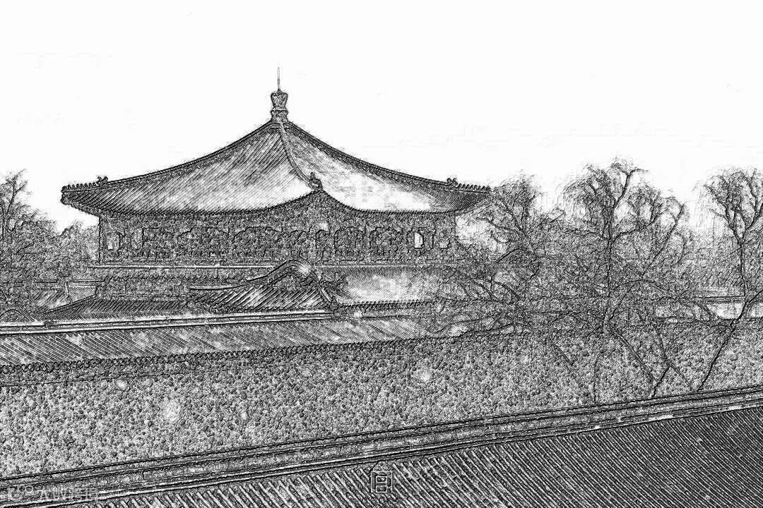 不过,突然想到,可以通过Python将故宫的建筑物图片,转化为手绘图(素描效果)。效果图如下:
