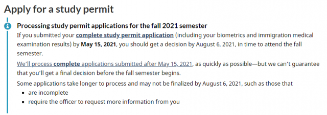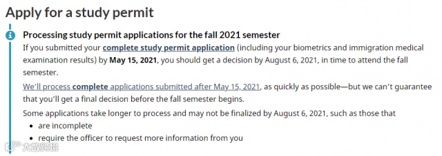 5. 加拿大移民局承诺,5月15日之前提交完整学签申请者将在8月6日前收到结果(如申请材料不完整,或需要补充材料,则可能延后)。5月15日之后提交的,移民局表示将会尽快处理,但无法保证在秋季学期开始前做出最终决定。