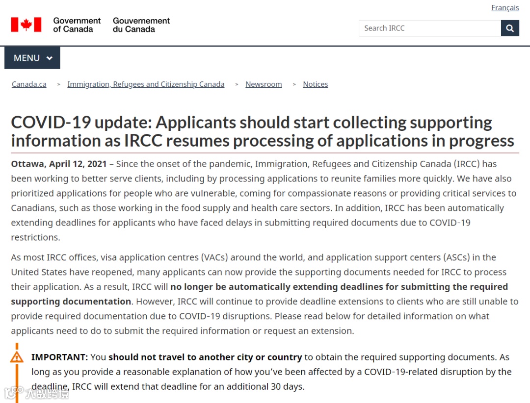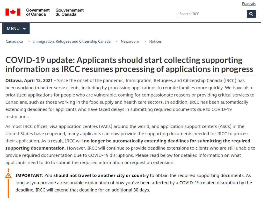 上月中旬,加拿大移民局(IRCC)正式宣布:将不再自动延长移民申请提交所需证明文件的截止日期。