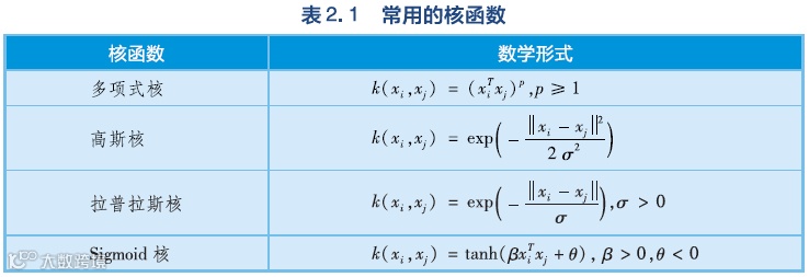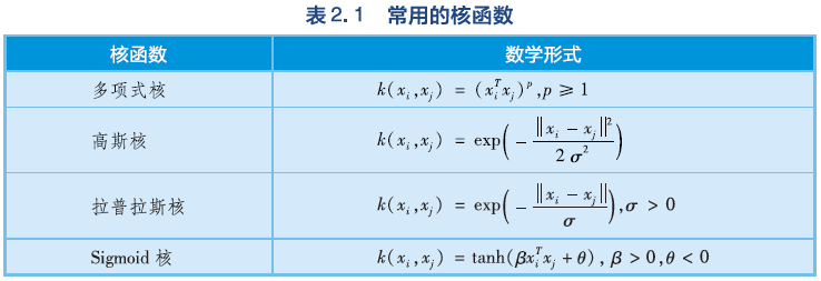 至此,我们弄清楚了核函数是如何和空间变换发生联系的。核函数可以有很多不同的选择,表2.1列出了几种常用的核函数。