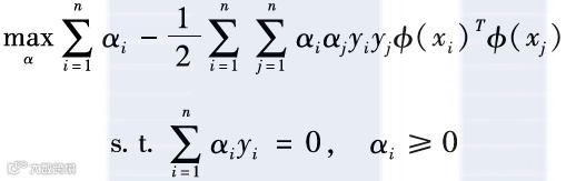 为了求解上述有约束的优化问题,一种常用的技巧是使用拉格朗日乘数法将其转换成对偶问题进行求解。具体来讲,支持向量机对应的对偶问题如下: