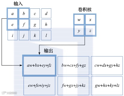 图2.10描述了一个2×2的卷积核将输入图像进行卷积的例子。所谓卷积就是卷积核的各个参数和图像中空间位置对应的像素值进行点乘再求和。经过了卷积操作之后,会得到一个和原图像类似大小的新图层,其中的每个点都是卷积核在某空间局部区域的作用结果(可能对应于提取图像的边缘或抽取更加高级的语义信息)。我们通常称这个新图层为特征映射(feature map)。对于一幅图像,可以在一个卷积层里使用多个不同的卷积核,从而形成多维的特征映射;还可以把多个卷积层级联起来,不断抽取越来越复杂的语义信息。
