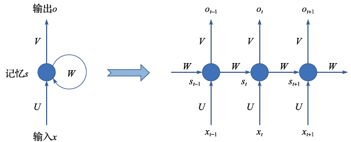 循环神经网络(Recurrent Neural Network,RNN)[14]的设计也有很强的仿生学基础。我们可以联想一下自己如何读书看报。当我们阅读一个句子时,不会单纯地理解当前看到的那个字本身,相反我们之前读到的文字会在脑海里形成记忆,而这些记忆会帮助我们更好地理解当前看到的文字。这个过程是递归的,我们在看下一个文字时,当前文字和历史记忆又会共同成为我们新的记忆,并对我们理解下一个文字提供帮助。其实,循环神经网络的设计基本就是依照这个思想。我们用