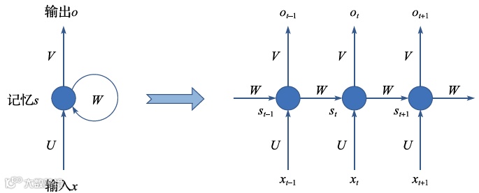 很显然,这个式子里蕴含着对于记忆单元的循环迭代。在实际应用中,无限长时间的循环迭代并没有太大意义。比如,当我们阅读文字的时候,每个句子的平均长度可能只有十几个字。因此,我们完全可以把循环神经网络在时域上展开,然后在展开的网络上利用梯度下降法来求得参数矩阵U、W、V,如图2.16所示。用循环神经网络的术语,我们称之为时域反向传播(Back Propagation Through Time,BPTT)。