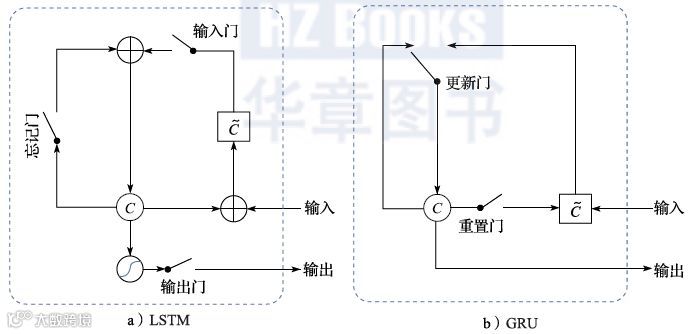 和全连接神经网络、卷积神经网络类似,当循环神经网络时域展开以后,也会遇到梯度消减的问题。为了解决这个问题,人们提出了一套依靠门电路来控制信息流通的方法。也就是说,在循环神经网络的两层之间同时存在线性和非线性通路,而哪个通路开、哪个通路关或者多大程度上开关则由一组门电路来控制。这个门电路也是带参数并且这些参数在神经网络的优化过程中是可学习的。比较著名的两类方法是LSTM[43]和GRU[44](如图2.17所示)。GRU相比LSTM更加简单一些,LSTM有三个门电路(输入门、忘记门、输出门),而GRU则有两个门电路(重置门、更新门),二者在实际中的效果类似,但GRU的训练速度要快一些,因此近年来有变得更加流行的趋势。