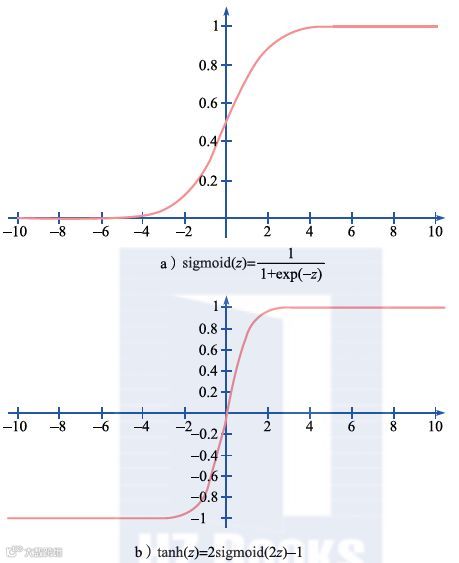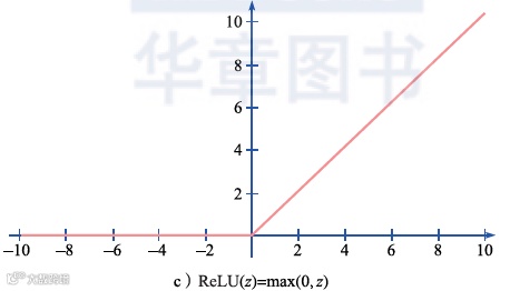 但是,由于阶跃函数本身不连续,对于机器学习而言不是一个好的选择,因此在人们设计人工神经网络的时候通常采用连续的激活函数,比如Sigmoid函数、双曲正切函数(tanh)、校正线性单元(ReLU)等。它们的数学形式和函数形状分别如图2.8所示。