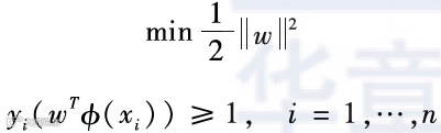 假设存在一个非线性映射函数Φ,可以帮我们把原始输入空间变换成高维非线性空间。我们的目的是在变换后的空间里,寻找一个线性超平面