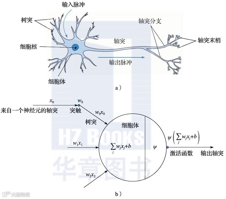 神经网络是一类典型的非线性模型,它的设计受到生物神经网络的启发。人们通过对大脑生物机理的研究,发现其基本单元是神经元,每个神经元通过树突从上游的神经元那里获取输入信号,经过自身的加工处理后,再通过轴突将输出信号传递给下游的神经元。当神经元的输入信号总和达到一定强度时,就会激活一个输出信号,否则就没有输出信号(如图2.7a所示)。