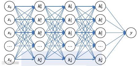 最基本的神经网络就是把前面描述的神经元互相连接起来,形成层次结构(如图2.9所示),我们称之为全连接神经网络。对于图2.9中这个网络而言,最左边对应的是输入节点,最右边对应的是输出节点,中间的三层节点都是隐含节点(我们把相应的层称为隐含层)。每一个隐含节点都会把来自上一层节点的输出进行加权求和,再经过一个非线性的激活函数,输出给下一层。而输出层则一般采用简单的线性函数,或者进一步使用softmax函数将输出变成概率形式。
