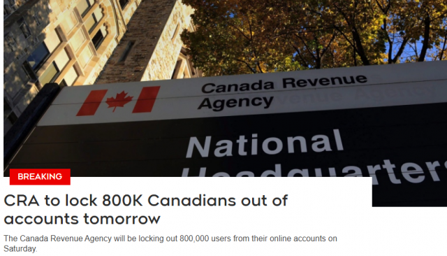 加拿大税务局(CRA)将在3月13日周六封锁80万加拿大用户的在线账户。