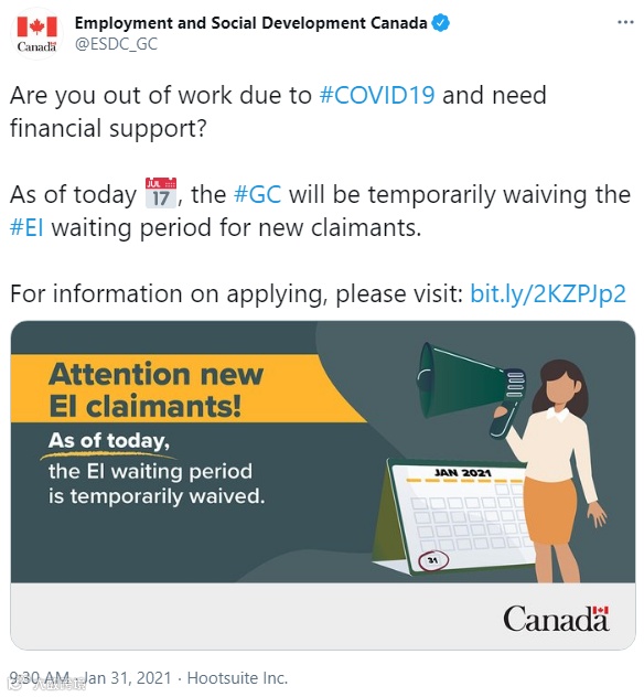 加拿大联邦就业和社会发展部昨天在推特上发布消息,为了帮助COVID-19疫情下失业或者需要财务支持的加拿大打工者,联邦政府将暂时取消新的就业保险(EI)申领的等待期。