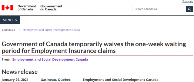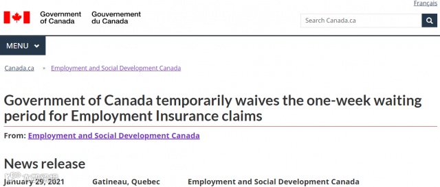 加拿大就业与社会发展部确认,凡是在2021年1月31日至2021年9月25日期间完成EI新申请的人,将免去等待期。