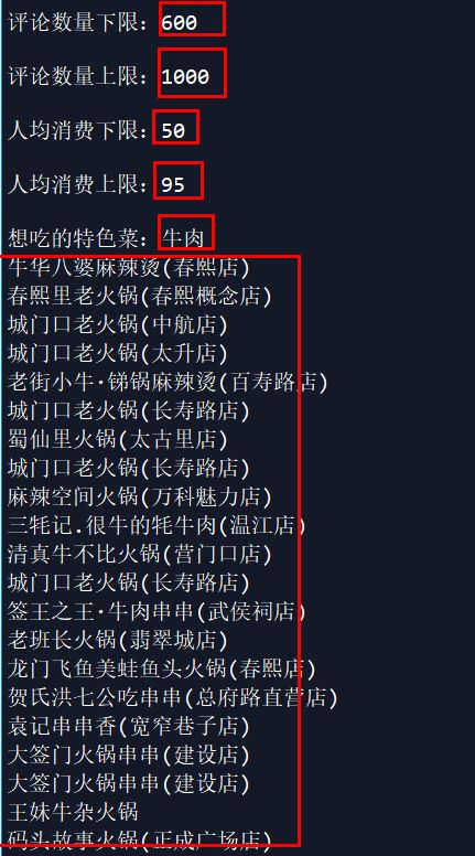 和我们想要的结果一致,在口味、环境、服务和星级上得分越高,我们就越推荐。然而推荐的店铺还是好多,能不能在集中一些呢?于是通过限制评论数量、人均消费和特色菜来进行推荐。由于我喜欢人少,便宜还有牛肉的店铺,这里得到了如下的结果: