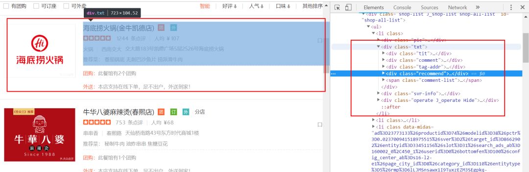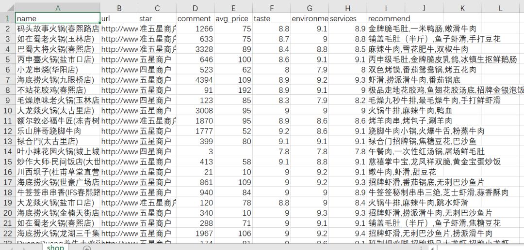 最后,我们获取了火锅50个页面的数据,每页15个数据,一共750家餐厅的数据。