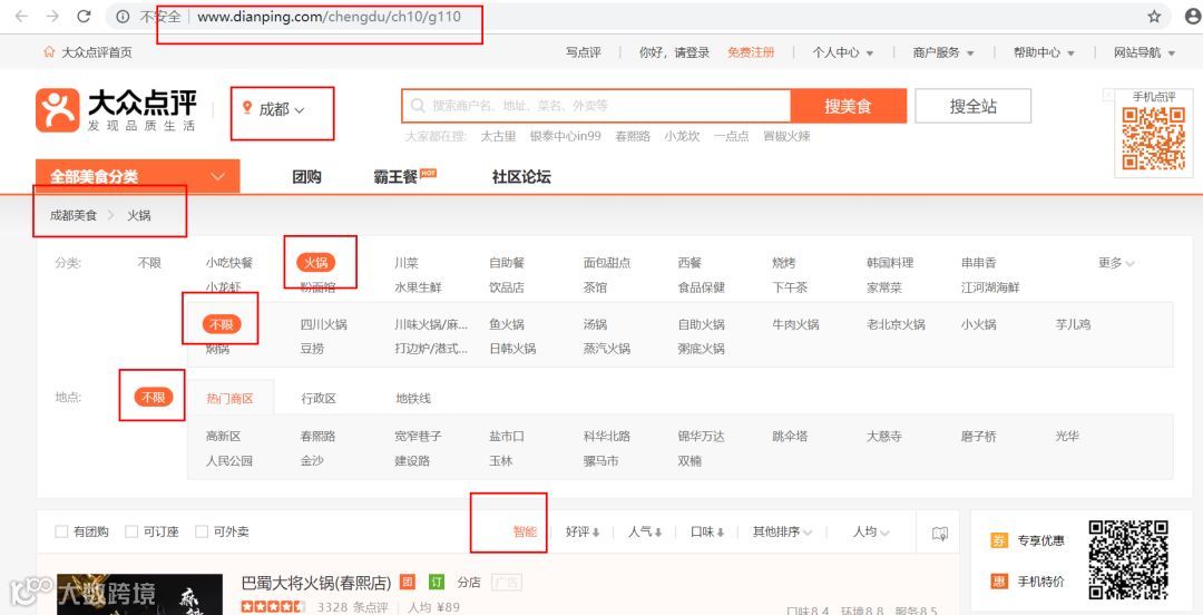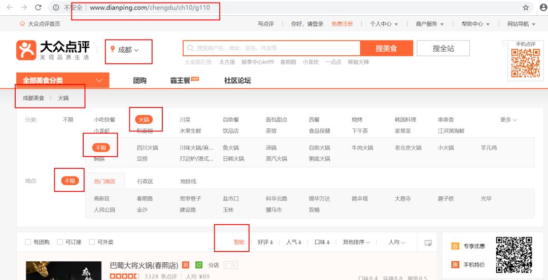 首先定位为成都,美食类型选的“火锅”,火锅具体类型选的不限,区域选的不限,排序选的智能,如图: