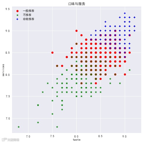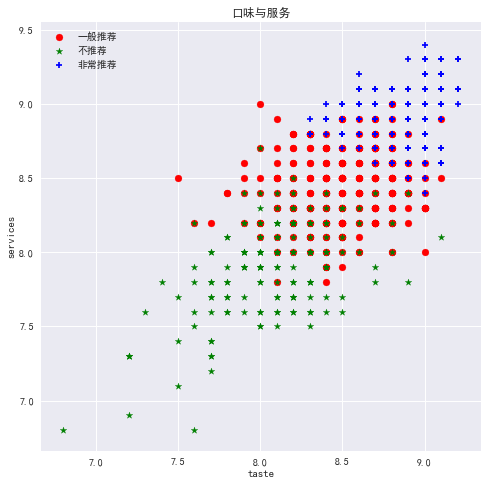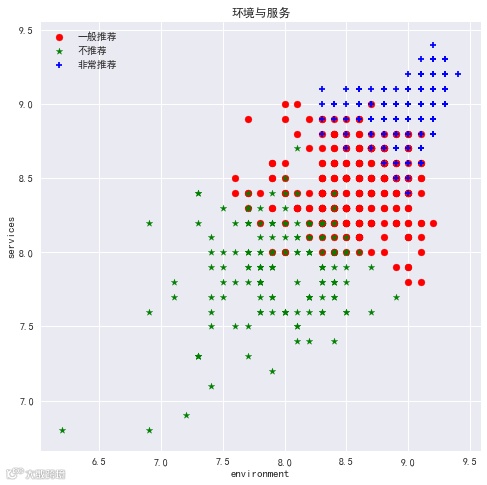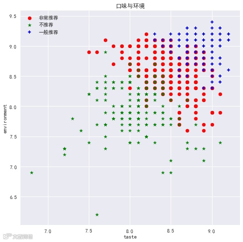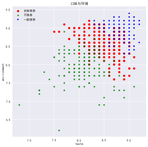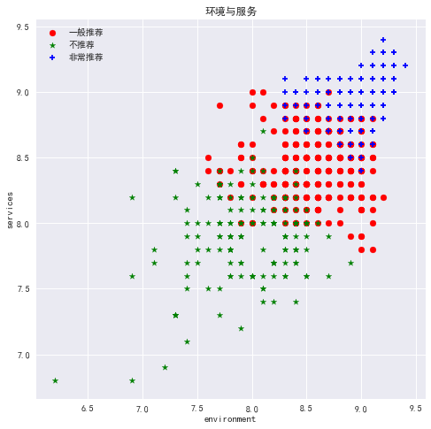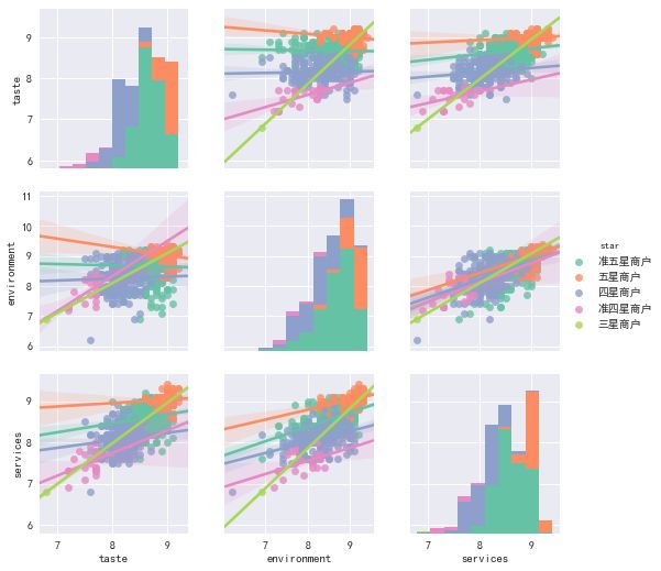 如图所看,并无什么直接关系,但是我们发现口味、环境和服务三者之间存在着非常好的线性关系,于是单独拿出来画了一个较大的图。