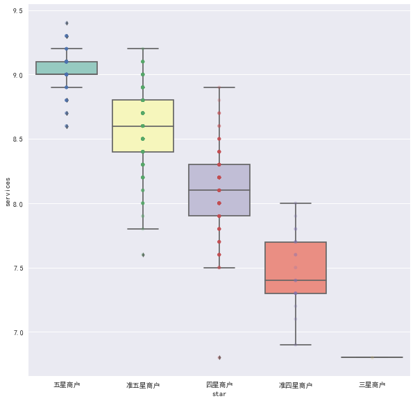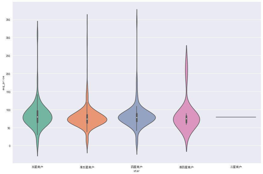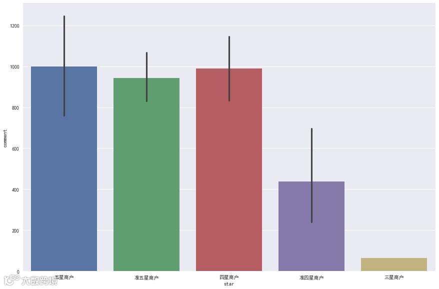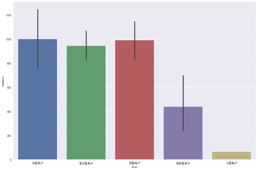 这里取其评论数平均值,发现对于四星以上商户来说,评论数和星级并不关系,但均比低于四星的饭店销量更好。这说明在四星以上之后,人们选择差别不大,但一般不愿意接受评论太差的饭店。