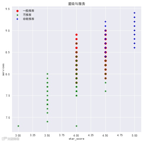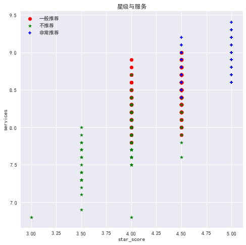 我们并且拟合了线性关系,由于三星商户只有一家,它的情况较为特殊之外,其他星级在口味、环境和服务的关系拟合中保持的相当一致,这也证明我们的猜想,这些变量之间存在线性关系。鉴于本文最大的目的是做推荐,于是,我们进行了K-means聚类,这里取K为3,并且把星级转换为数字,五星对应5分,准五星对应4.5分,以此类推。最终得到了三类,通过作图,看看聚类情况如何吧。