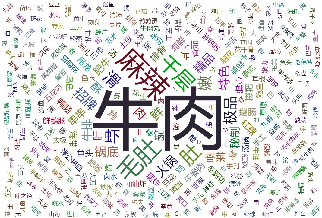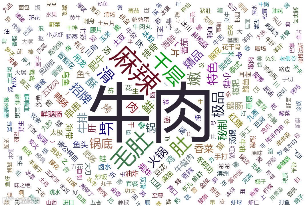 吃火锅,一家店的生意好坏,肯定还和它的特色菜有关,通过jieba分词,将爬取到的推荐菜做了一个词云图,如下。