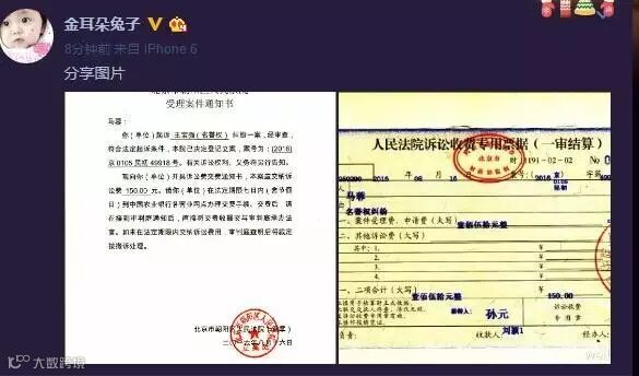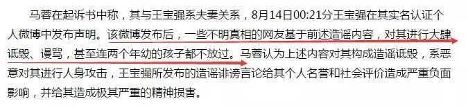 马蓉委托律师到朝阳法院立案,以名誉侵权为由起诉王宝强删除8月14日00:21分发布的微博并赔礼道歉:
