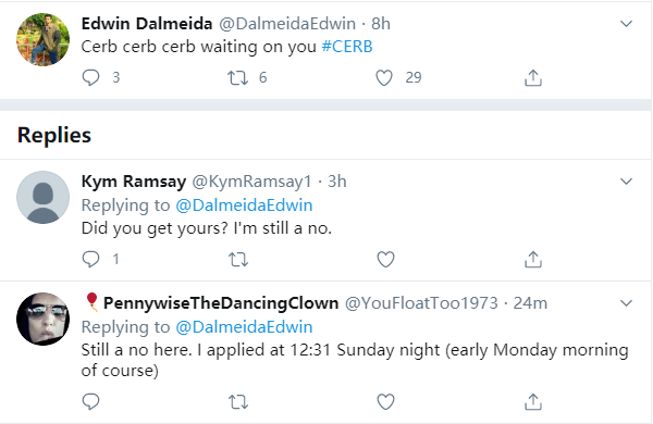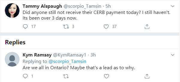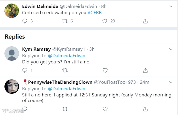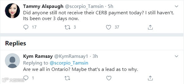 网友@Tammy Alspaugh:有没有人到现在还没收到CERB?已经超过3天了,我还没收到。