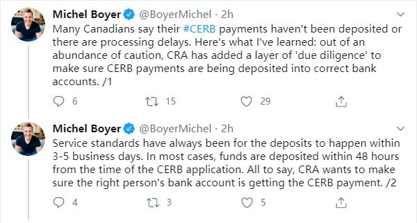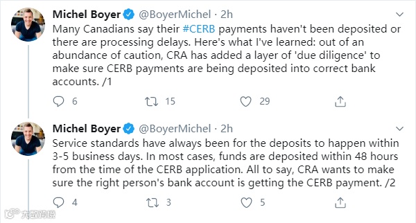 一位在相同话题发言的官员表示,最近几周出现了许多“ CERB欺诈”的案件,加拿大人报警称,有人试图改变CERB发放地址,或被告知他们已经获批福利金,但他们从未申请过。因此,CRA已出台了新的调查核实措施,以确保福利金能够到达正确的银行帐户。本周的的福利金将于周四下发,并于周五到达申请人的银行账户。