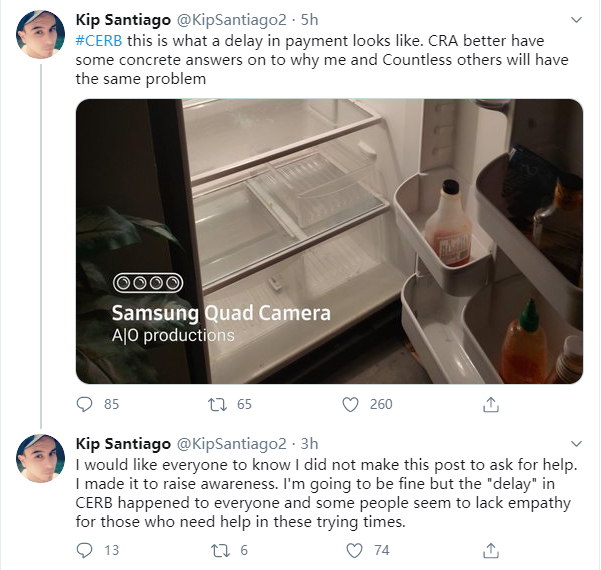 网友@Kip Santiago:这就是CERB延迟到账的结果,希望CRA能给我一个合理的解释。