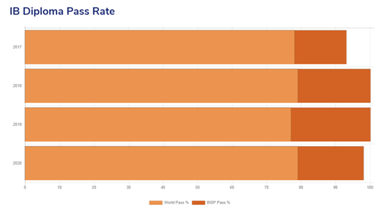 BISP不仅是普吉岛上教学质量最好的国际学校,即便放眼全泰国BISP也是最顶尖的。2020年BISP共有高中毕业生61人,他们来自30个不同国家其中有12名学生为双重国籍。在泰国完全采用IB课程的21所国际学校里BISP的学生IBDP平均分为35排名第二位,远高于泰国平均分的32.97以及全球平均分的29.9,学生考试通过率为98%也远泰国平均通过率的91.76%和全球平均通过率79%,获得40分以上得分的学生人数为8人占比为13.1%高于全球平均水平的9.4%,其中有1名学生获得了满分45分(2020年全球IBDP考试共174355人有141人获得满分)。