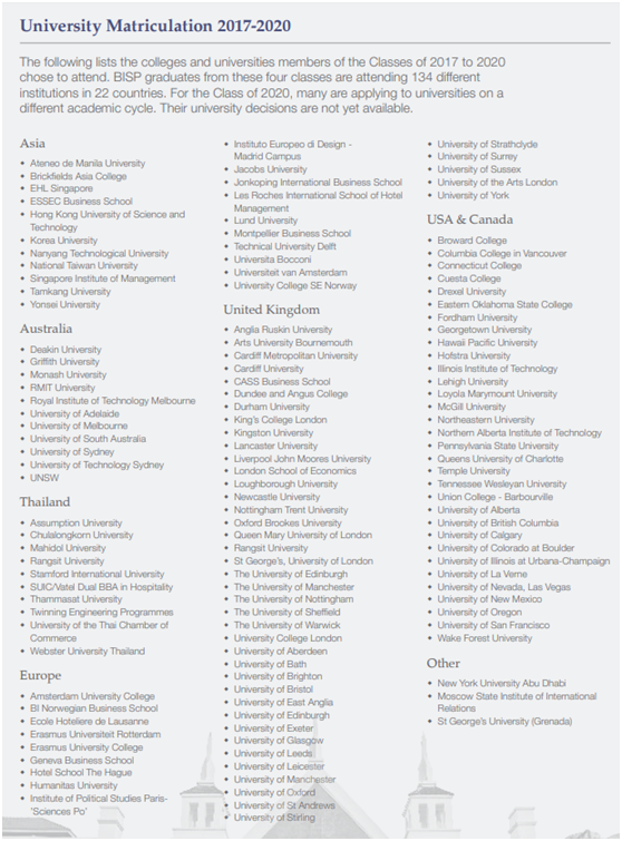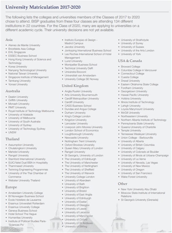 2017-2020年的4个毕业班学生现今正在22个不同国家的134所大学就读,其中包括牛津大学、伦敦大学学院、爱丁堡大学、曼彻斯特大学、伦敦大学国王学院、悉尼大学、墨尔本大学、伊利诺伊大学香槟分校、新加坡南洋理工、香港科技大学等世界排名前50的名校。